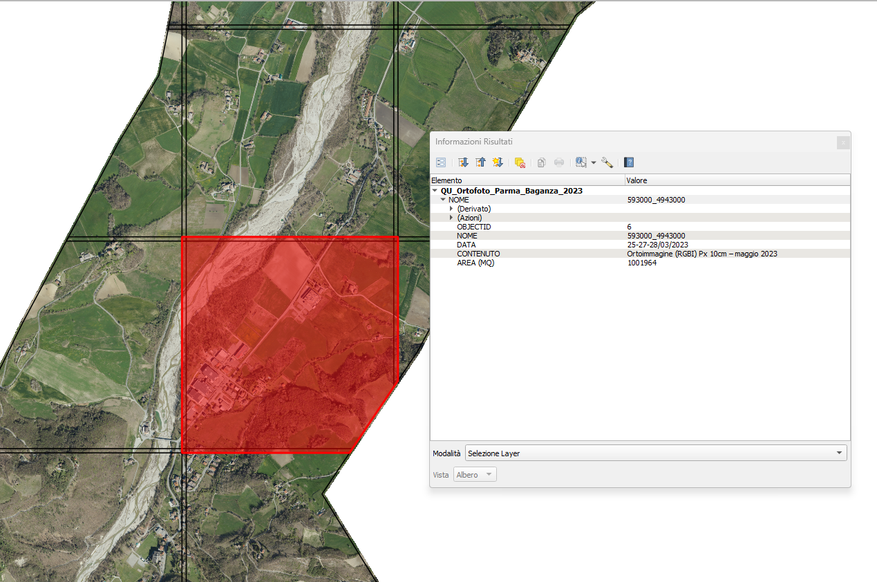 Data base vettoriale, poligonale, relativo alla copertura delle ortofoto 10cm/px - rilievo T. Parma e Baganza 2023 (realizzato da CGR S.p.A. nel mese di maggio 2023 su commissione dell'Agenzia per la Sicurezza Territoriale e la Protezione Civile - Settore Sicurezza Territoriale e Protezione Civile E